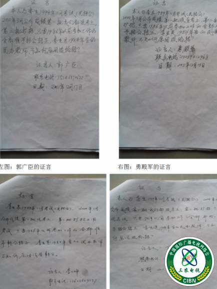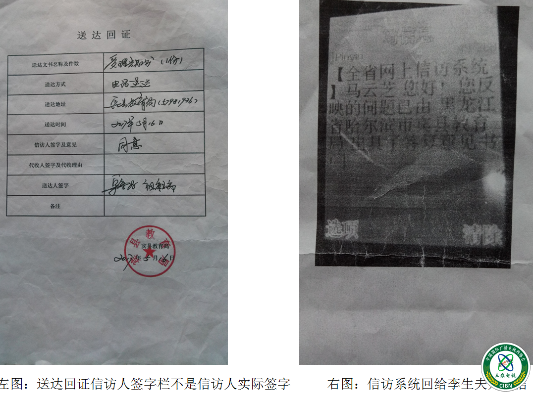 李生的妻子马云芝向记者展示丁凤君、李乃坤、勇殿军、郭广臣四人的证言(见上图),证言内容:本人与李生1999年11月考试(民转公),2000年3月公布成绩,第一批没有考上,第二批扩招,只要1986年以前参加工作的全部准予转公转正,李生是1984年当的民办教师,不知何原因没给转?她向教育局领导反映,领导说李生没有编,她随后又拿出来另一位胜利镇长治学校王越奇老师的任用证,上面显示编内民办的章任用证,教民办字第1444号,发证时间是90年9月25日。参加民办时间1985年3月。自己丈夫李生的显示也是编内民办的章任用证,教民办字第1442号,发证时间是90年9月15日,参加民办时间1984年8月。马云芝说王越奇与李生都是一批的证,为啥他民办都可以转公办,李生的为啥不能转。2017年5月16日受理告知书上我及李生本人均未签字,宾县教育局在上面就签字同意,隐瞒上级领导,说着就把送达回证单取出来让记者看。