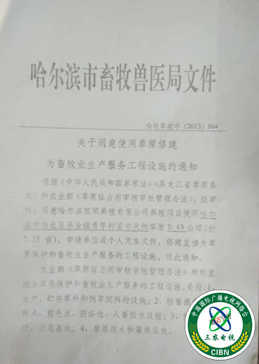 本网讯(首席记者 唐云立)哈尔滨市恒顺饲料厂位于哈尔滨市松北区乐业镇青年村,法人赵岩,于2013年6月11日与青年村村委会签定22400平方米草原承包合同,并开始修建厂房。2014年8月13日取得营业执照,2013年12月30日哈尔滨市畜牧兽医局下文同意该厂为草原修建畜牧生产服务工程设施的通知(如图)。