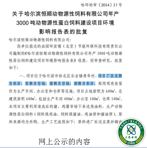 2014年8月4日,哈尔滨市环境保护局松北分局下发了建设项目环境保护的批复;2016年8月10日黑龙江省畜牧兽医局下发饲料生产许可证。