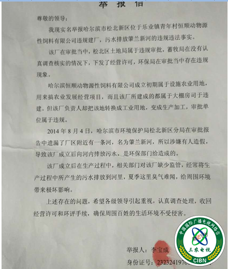2019年1月16日上午,记者第一时间将举报人的举报材料转交到哈尔滨市环境保护局松北分局办公室,希望能给当事人一个合理的解释。可时至今日,该局没有任何反馈信息,不知是为什么呢?望哈尔滨市环境保护局松北分局本着有错必纠的原则,采取有效措施,收回该厂的相关审批手续,依法对该厂进行处理,还老百姓一个绿水青山。最终处理结果,人们试目已待,记者将继续关注。