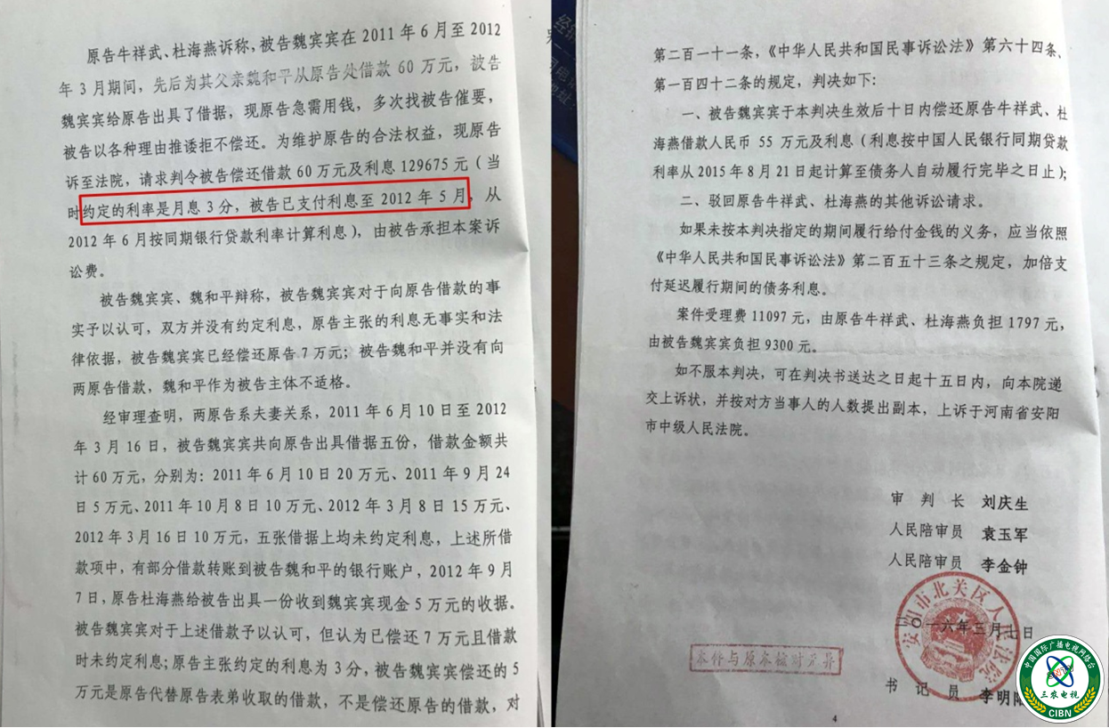 魏和平和魏宾宾给记者提供了几张河南省安阳市北关区人民法院的生效判决书,其中一张判决书的原告是牛详武和杜海燕,该判决书原告诉称中有这样一句话:当时约定的利息是月息3分。