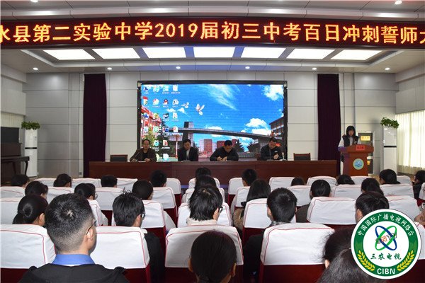 三农电视台3月8日讯(通讯员:王永笑 谭永善 陆光峰)“我想要怒放的生命,就像矗立在彩虹之巅,就像穿行在璀璨的星河,拥有超越平凡的力量”,3月7日,在铿锵有力、催人奋进的音乐旋律中,山东沂水实验二中初三全体师生齐聚学校礼堂举行了百日誓师大会,“亮剑”中考。