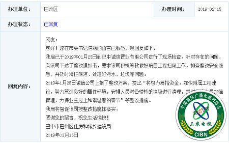 2019年2月15日,巴中市巴州区住房和城乡建设局答复称:“我局已于2019年1月25日到巴中诚信置业有限公司进行了现场检查,针对存在的问题,向该司下达了整改通知书,要求该司积极筹款做好项目工程扫尾工作,排查整改安全隐患,并及时清扫保洁,处理好污水、垃圾等问题。2019年1月28日诚信公司上报了整改方案,提出‘将极力筹措资金,加快附属工程建设,努力营造良好的居住环境,安排人员对各楼栋的垃圾进行清理,并对保洁人员加强管理,力保业主过上和谐温馨的春节 ’等整改措施。我局将督促该司按整改措施抓落实。” 但时至今日,问题依旧没有得到妥善解决。