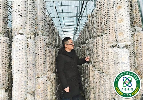 上图 湖北十堰市房县土城镇铜雀城村天禾食用菌合作社理事长汪远飞在察看菌菇棒木耳生长情况。