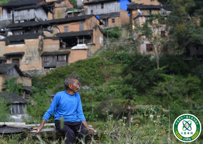 “空心村”内,一位老人坐在栅栏上 宋为伟 摄