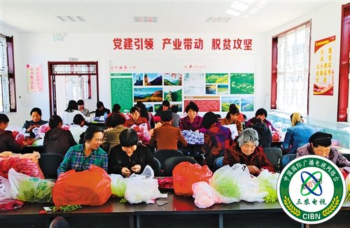 天津市津南区投入资金400万元,帮助隆化县打造手工花扶贫项目。图为该县茅荆坝乡扶贫车间。