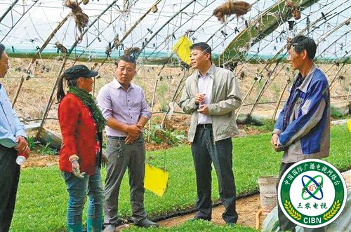 天津挂职干部刘明杰(右二)在隆化县偏坡营乡硕盈食品有限公司西红柿育苗大棚了解种植情况。 赵 辉摄 (中经视觉)
