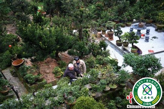 徽派盆景传承人洪观清老人正在和儿子一起为自家院子里的盆景进行修剪。 韩苏原 摄