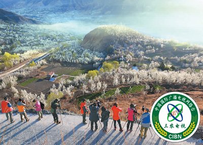 四川省金川县地处高山草地和高原阔谷的结合部,是中国八方闻名的高原古树雪梨产区。每年3到4月,上百万株梨树的梨花相继绽放,似一片花的海洋,令人叹为观止。图为2019四川生态旅游节暨金川县第六届古树梨花节上,游客在拍照。