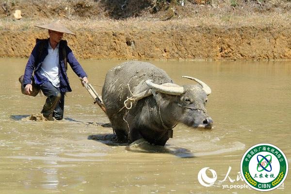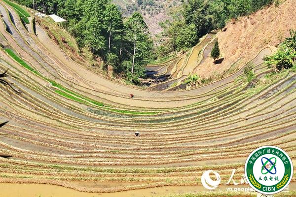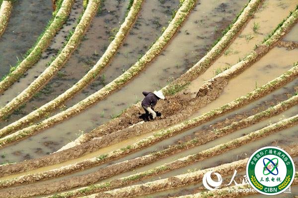 梯田里耕种的农民 人民网 程浩 摄