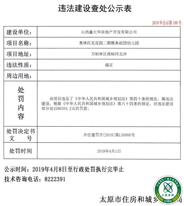 人民网太原4月9日电(张婷婷)4月8日,太原市住房和城乡建设局公开发布一张关于山西鑫大华房地产开发有限公司违法建设查处的公示表。公示表中显示,该公司位于太原市万柏林区虎峪河北岸的奥林匹克花园二期雅典组团幼儿园因越证问题被查处。