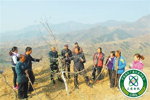 专业技术人员在皇迷村万亩果园里为果农讲解苹果修剪技术。 王永周摄(中经视觉)