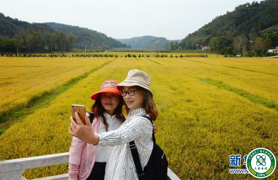 两名外地游客在陕西省延安市南泥湾镇南泥湾村的稻田旁留影(9月12日摄)。