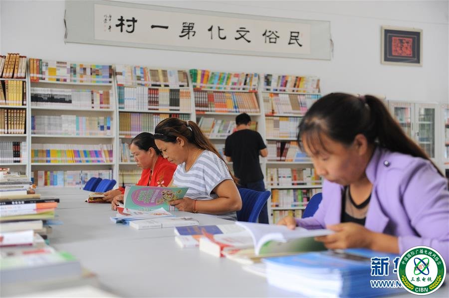 8月21日,吴忠市红寺堡区大河乡香园村村民在该村图书室看书。