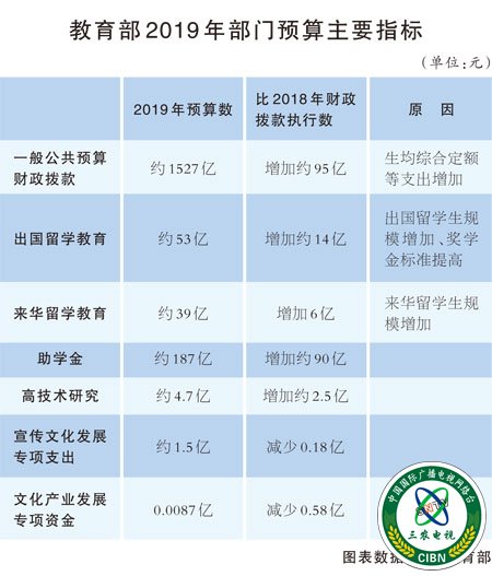 关于资金来源,教育部2019年部门预算显示,2019年一般公共预算财政拨款约为1527亿元,比上年执行数增加约95亿元。其主要原因为生均综合定额、出国留学经费以及学生资助工作专项等支出增加。