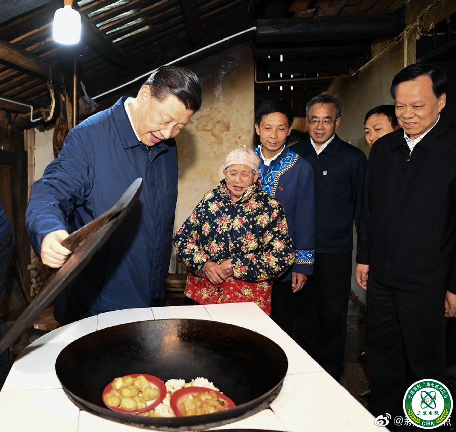 15日下午,正在重庆市调研的习近平总书记来到石柱土家族自治县中益乡华溪村村民、老党员马培清家中,同村民代表、扶贫干部围坐院中,共话脱贫攻坚。新华社发