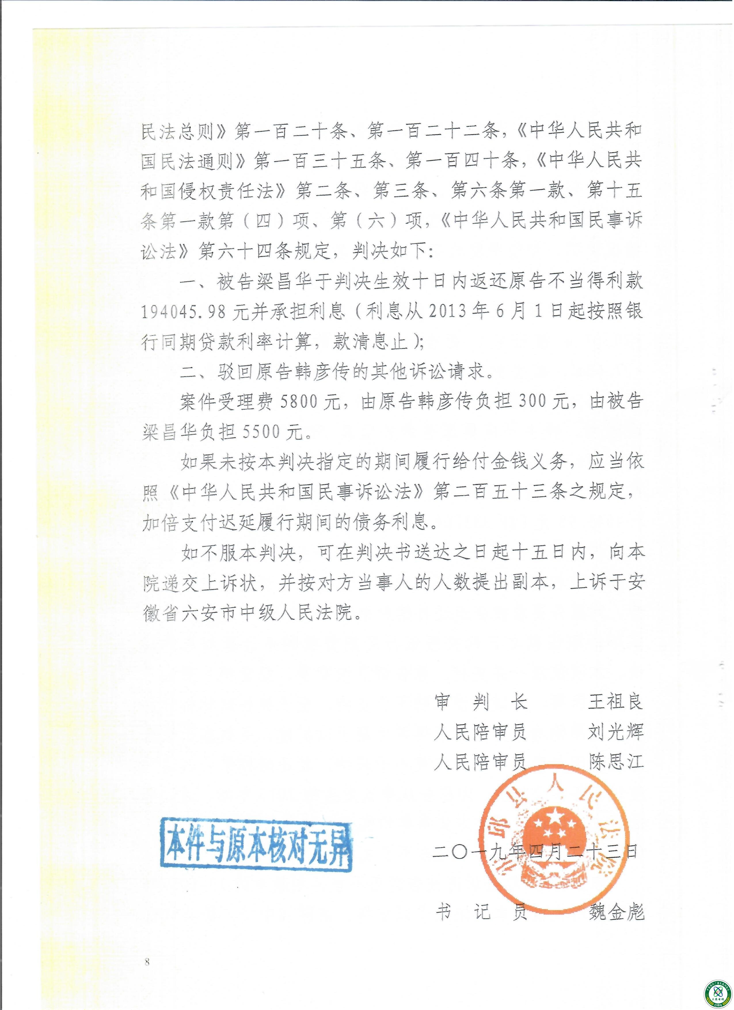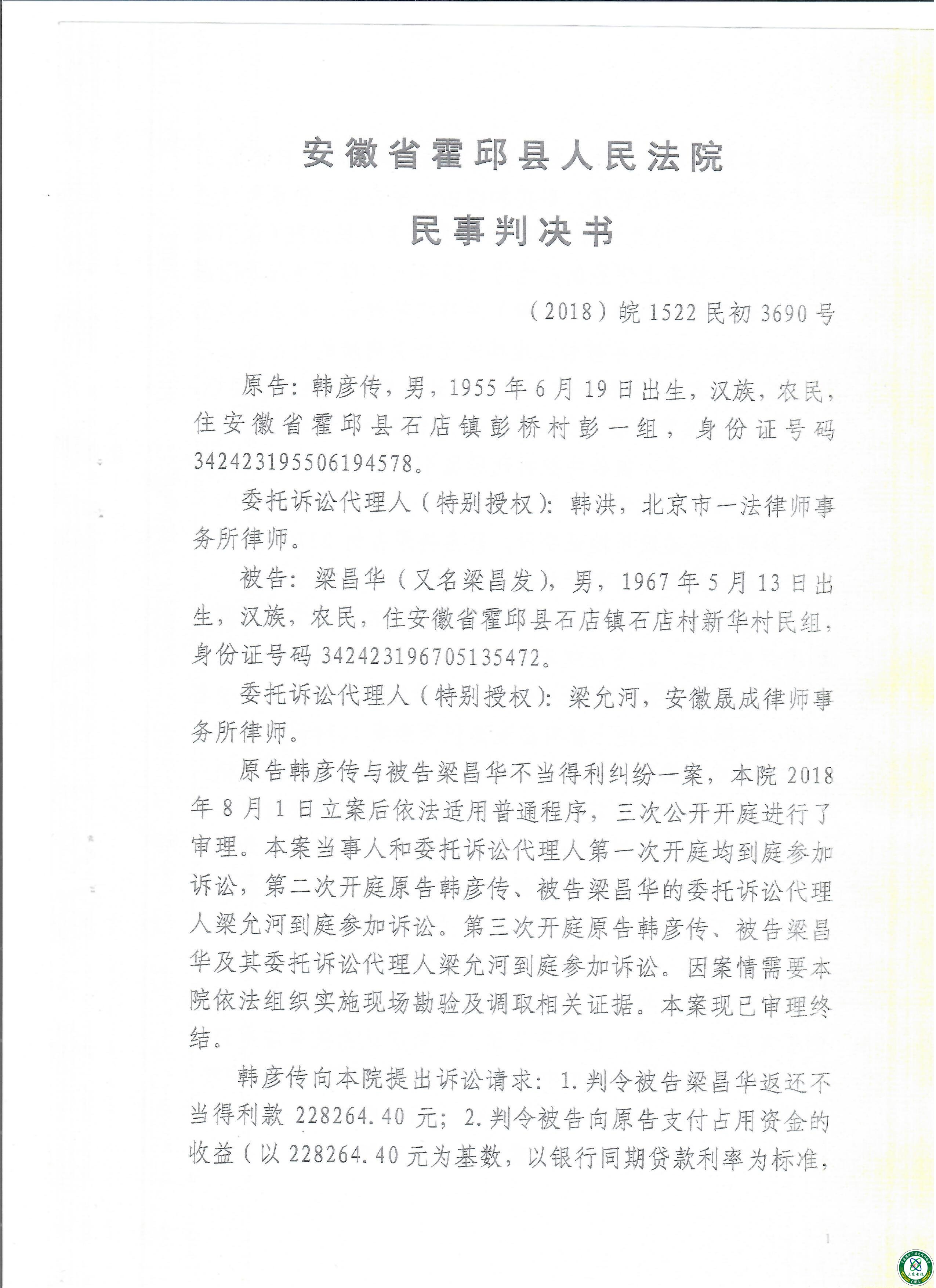 原告韩彦传与被告梁昌华“不当得利”纠纷一案,历经六年,为此霍邱法院于2018年6月正式立案,至结案历经霍邱法院三次公开审理,原被告多次举证,质证法官公正研判,在原告有力举证下,法院戳穿被告种种谎言和伪证,最终作出了公正判决——被告冒领者梁昌华败诉。