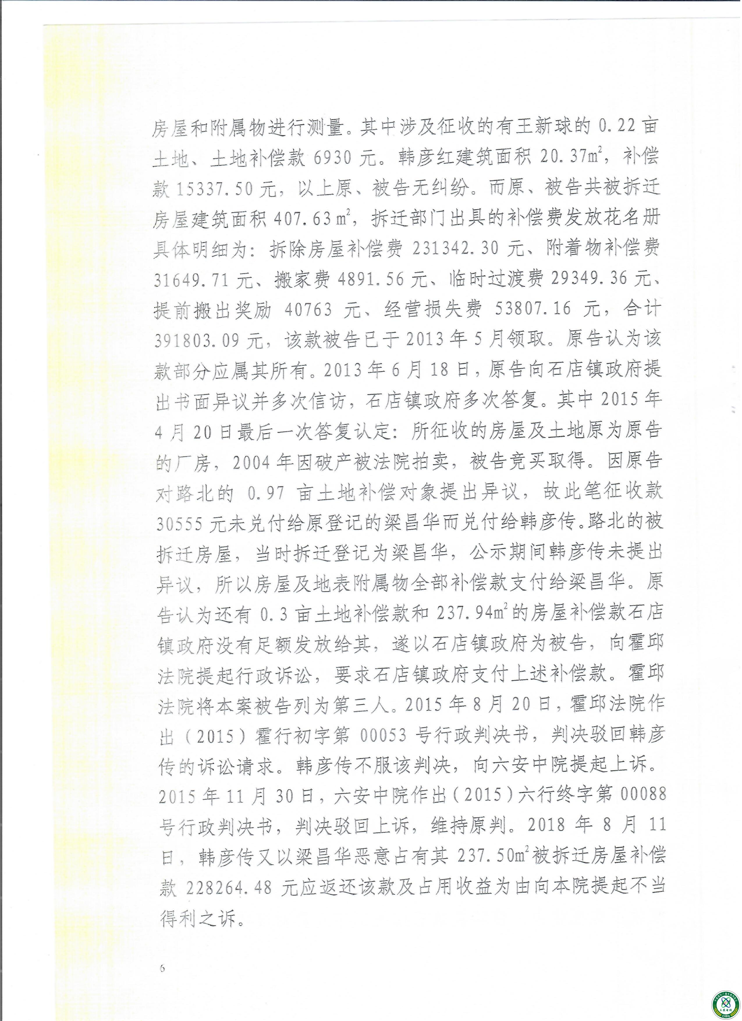 由于时任镇长李仁合不作为二次行政复议均要求处理和县国土局下文让石店镇政府处理、李仁合置之不理后把案件推致霍邱县法院、六安,霍邱法院先后六次开庭原告韩彦传均以败诉终结、(败诉原因是,此案背后有被告的一个保护伞在背后作梗)后告到省高院这次总归把140203712351号<<建设用地使用权证>>假证给注消了、可是冒领款一直没有得到法律程序的认可、最后走向了上访路。在县政法委、县信访局 县法院的安排下又以法律程序开始重新审理结案。