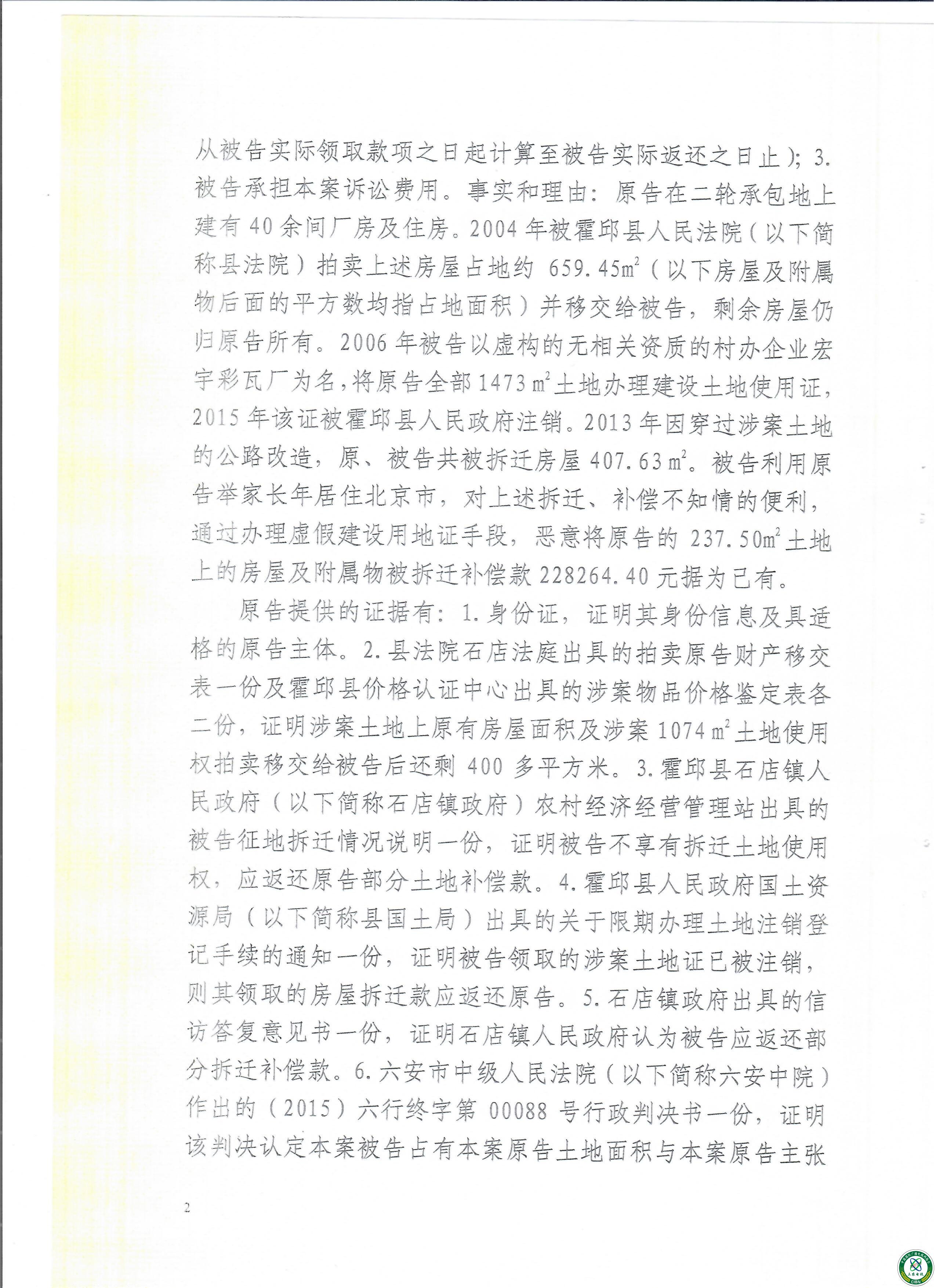 此案原告在2004年因经营不当破产还债原因,霍邱县法院(石店镇法庭)把原告上述土地中位于路北的部分房屋(约659.45m
