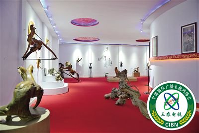 根雕艺术馆内摆满形象生动的根雕艺术品。