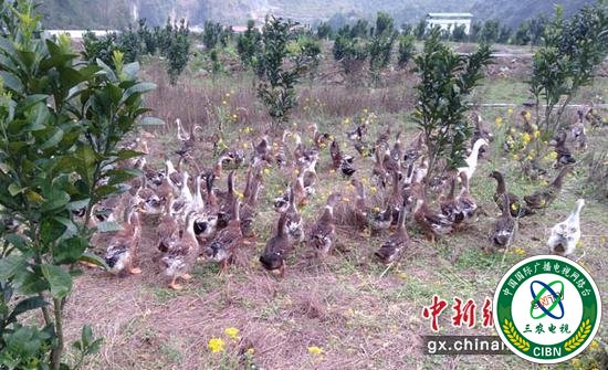 自2016年以来,滕树扬在创业中摸索,在自己的橘红基地发展立体经济。“为充分利用资源,我还在基地里放养了2000多只凌云乌鸡和1000多只鸭子,目前今年的第一批乌鸡和鸭子刚好准备出栏销售,乌鸡收入今年有望突破4万元,鸭子收入2万元左右。”正在喂鸡鸭的基地管理员、贫困户罗明一介绍说。