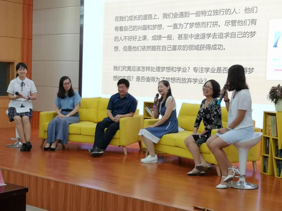 学生代表林丹,广东广雅中学校长助理、德育处主任王穗芳,中山大学中文系教授、博士生导师李炜,家长代表李华,家长代表黄航星(从左到右)