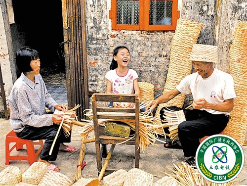 图②斗门乡村的祖孙三人坐在家门口编织竹笼。传统工艺不仅带来了经济收入,还能怡养性情。