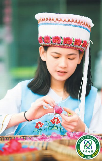三农电视台讯:近年来,贵州省毕节市大方县核桃乡木寨村发展种植食用玫瑰花,既可用于加工生产玫瑰花食品,又带动了当地乡村旅游的发展。图为木寨村的村民在马白寨度假村拣选花瓣。