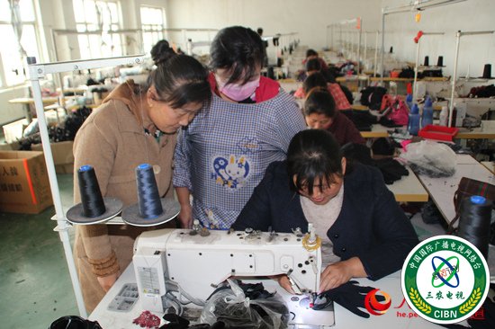 图为大名县西付集乡手套加工扶贫微工厂内老员工向新员工展示手套技艺。