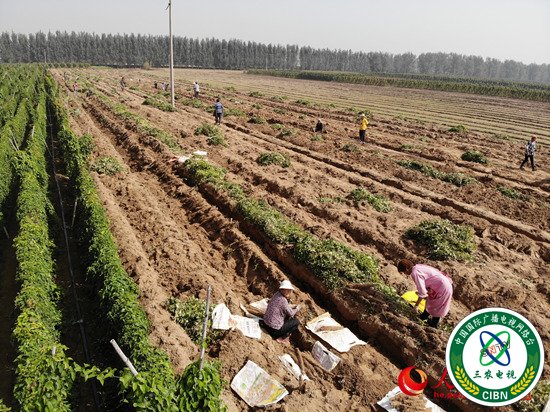 图为贫困户在张集乡东部白玉山药经济带基地进行收获山药。