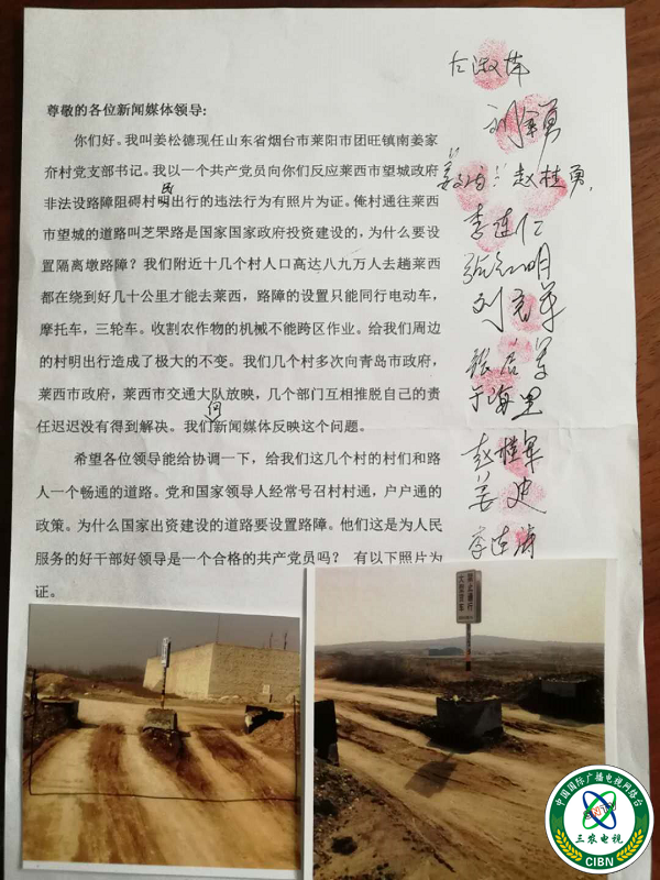 村民姜某说:“时下眼看种植的小麦马上要收割了,请联合收割机来收割麦子,但收割机无法进来,只能绕道几十公里才能来到这里,老百姓种地本身不易,收割机绕道费用明显增加不少,给我们增加不少负担,多次向莱西方面反映,没有任何的回复,现在非常无奈?。”