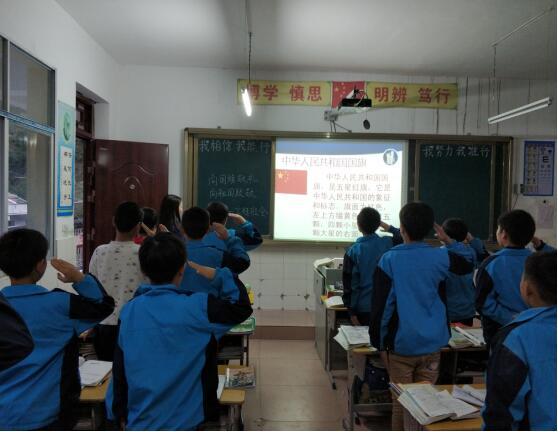各班级广泛动员,通过组织丰富多彩的活动,学生们热情高涨,积极参与。我校七个年级班,均利用班级图书角和图书室,广泛阅读历史故事、革命故事、改革开放故事,培育民族精神,增进爱国情感。唱好课前一支歌,歌唱爱国歌曲,传弘扬爱国主义、集体主义、社会主义思想;并利用好德育课,进行爱国主义专题班会课引导学生树立远大志向。并以班级为单位,积极开展“向国旗敬礼”为主题的爱国主义主题班会等活动。