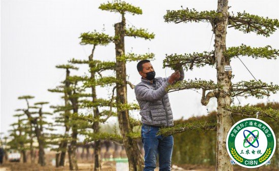 4月8日,工人在河北省霸州市“田园牧歌”绿化片区内修剪造型树。