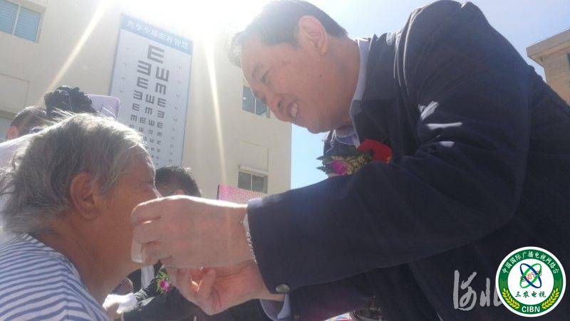 5月31日,“侨界助力脱贫攻坚光明行”活动走进张家口。图为与会领导为接受手术的患者揭纱。记者刘雅静摄