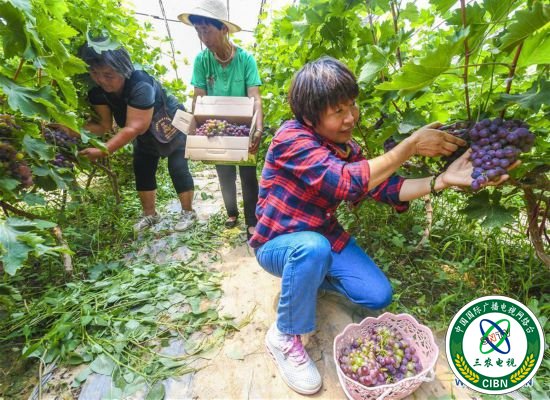 6月19日,在衡水市桃城区邓庄镇一家农场,果农忙着采摘葡萄。 新华社记者 李晓果 摄