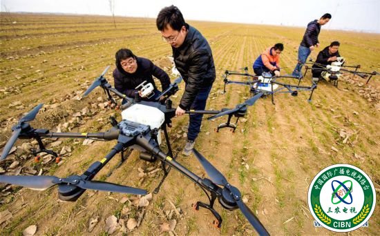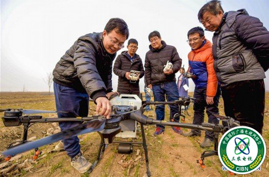2月25日,在衡水市冀州区徐庄乡北榆林村,无人机教员(左二)指导村民对植保无人机进行起飞前的检查。