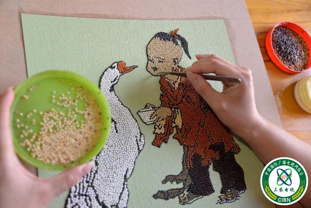 ↑寿东村的姑娘们变身“粮画艺人”,在“粮画”工作室上班。