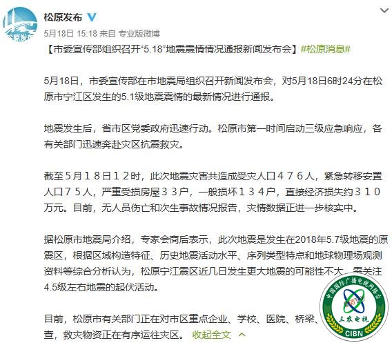 5月18日,松原市委宣传部在市地震局组织召开新闻发布会,对当日6时24分在松原市宁江区发生的5.1级地震震情的最新情况进行通报。地震发生后,省市区党委政府迅速行动。松原市第一时间启动三级应急响应,各有关部门迅速奔赴灾区抗震救灾。截至5月18日12时,此次地震灾害共造成受灾人口476人,紧急转移安置人口75人,严重受损房屋33户,一般损坏134户,直接经济损失约310万元。目前,无人员伤亡和次生事故情况报告,灾情数据正进一步核实中。松原市有关部门正在对市区重点企业、学校、医院、桥梁、机场等进行排查,救灾物资有序运往灾区。