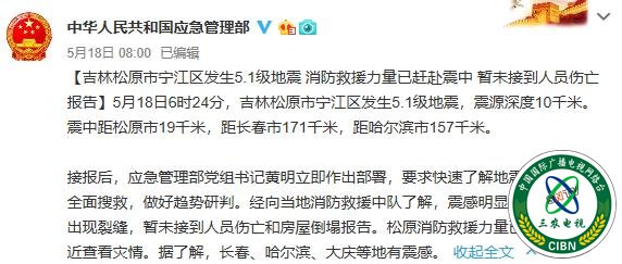 据应急管理部消息称,接报后,应急管理部党组书记黄明立即作出部署,要求快速了解地震情况,指导全面搜救,做好趋势研判。经向当地消防救援中队了解,震感明显,有个别房屋出现裂缝,暂未接到人员伤亡和房屋倒塌报告。松原消防救援力量已赶赴震中附近查看灾情。据了解,长春、哈尔滨、大庆等地有震感。