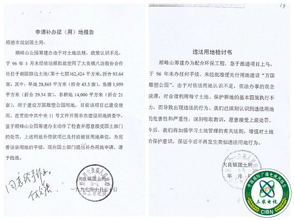 村民提供的一份顺德市政府1995年的文件显示,在《关于同意增加顺峰山公园用地范围的批复》中,政府同意增加顺峰山公园用地范围,新增用地面积306.54公顷(折合4598亩)。被用地单位包括大良镇的五坊、八坊、大门、云路、府又等管理区。整个顺峰山公园的总用地面积为547.31公顷(折合8209.55亩)。