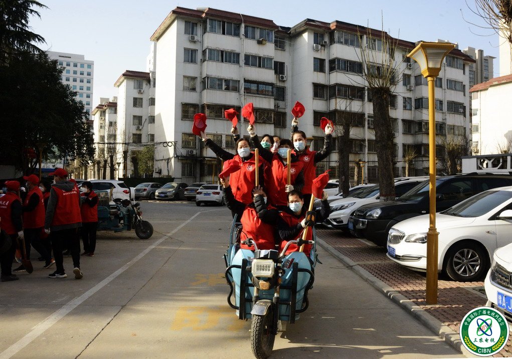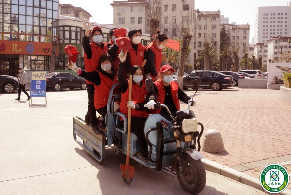 2020年3 月12日,昨日(11日)郑州市二七区绿云小区20多名志愿者,头戴小红帽,身穿红马夹,肩扛铁锹、镢头等植树工具,在改造后小区需要栽植树苗的空闲地,栽下一百多株海棠、樱花等树苗。图为志愿者们站在电动三轮车上,一手拿着铁锹,一手舞动小红帽开心去植树。吴贤德摄影