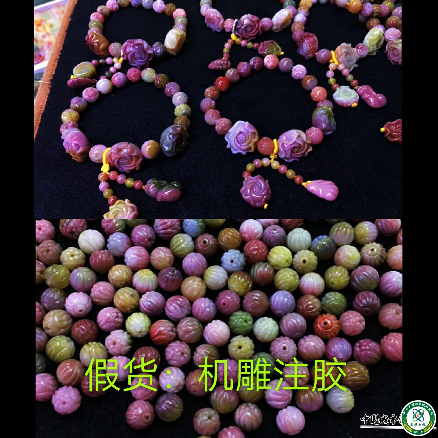 首先是所选用的材质不同,能够花费人工来雕琢的五彩玉饰品,基本都是非常上乘的盐源五彩玉,不但颜色,质地好,块度也是相对较大的,主要面向高端市场。而机器雕的珠子也好,饰品也好,就是我们常说的大路货,品相质地都很普通。