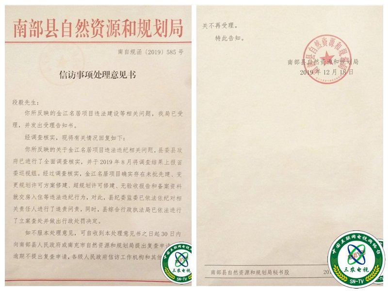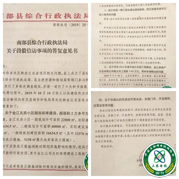 南部县自然资源和规划局2019年12月18日的信访答复意见也显示,金江项目确实存在未批先建、变更规划许可方案修建、超规划许可修建、无验收报告和备案资料就交房入住等违规违法行为。南部县纪委监委已将相关调查结果上报省委巡视组。