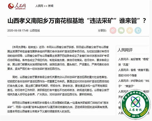 本网锐评 日前,山西省孝义市南阳乡以建“万亩花椒基地”为由却违法采矿事件遭媒体曝光,值得一提的是,此前当地官方消息公告,“山西省公安厅与山西省国土资源厅将在全省范围联合组织开展打击非法采矿违法犯罪专项行动”。