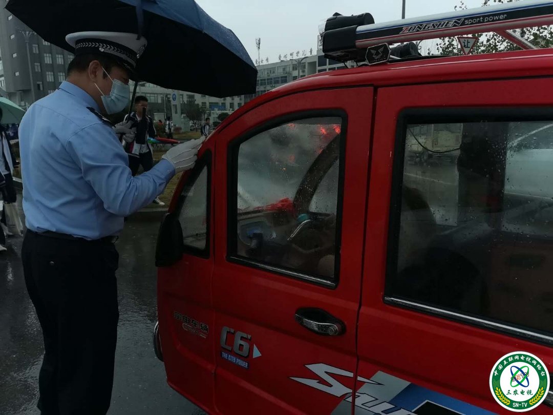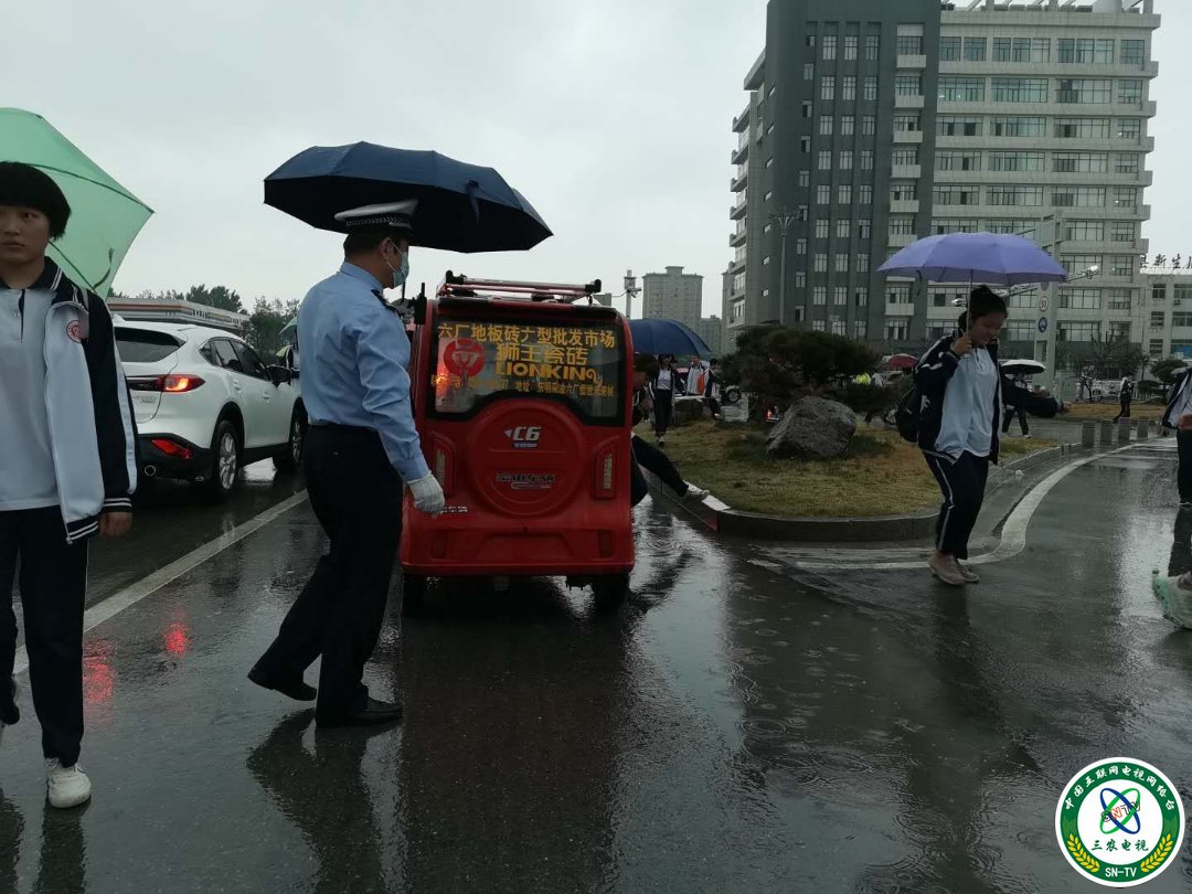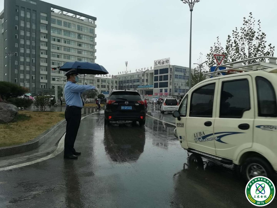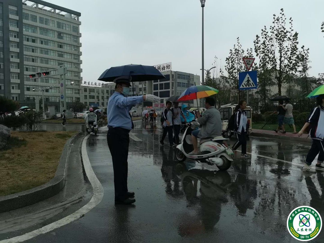山东东明县公安局副局长朱卫东带领民警雨中值勤保交通安全