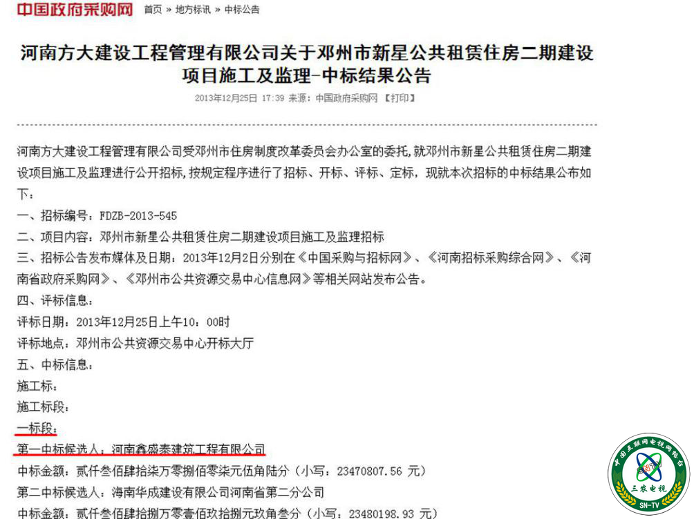 中国政府采购网上招标公告显示,2013年12月3日,河南方大建设工程管理有限公司发布邓州市新星公共租赁住房二期建设项目及监理招标公告;2013年12月25日,发布该项目中标公告,总共5个施工标段,1个监理标段,河南鑫盛泰公司是一施工标段,第一中标人,中标金额2347.0807万元,整个工程中标额度1亿多元。