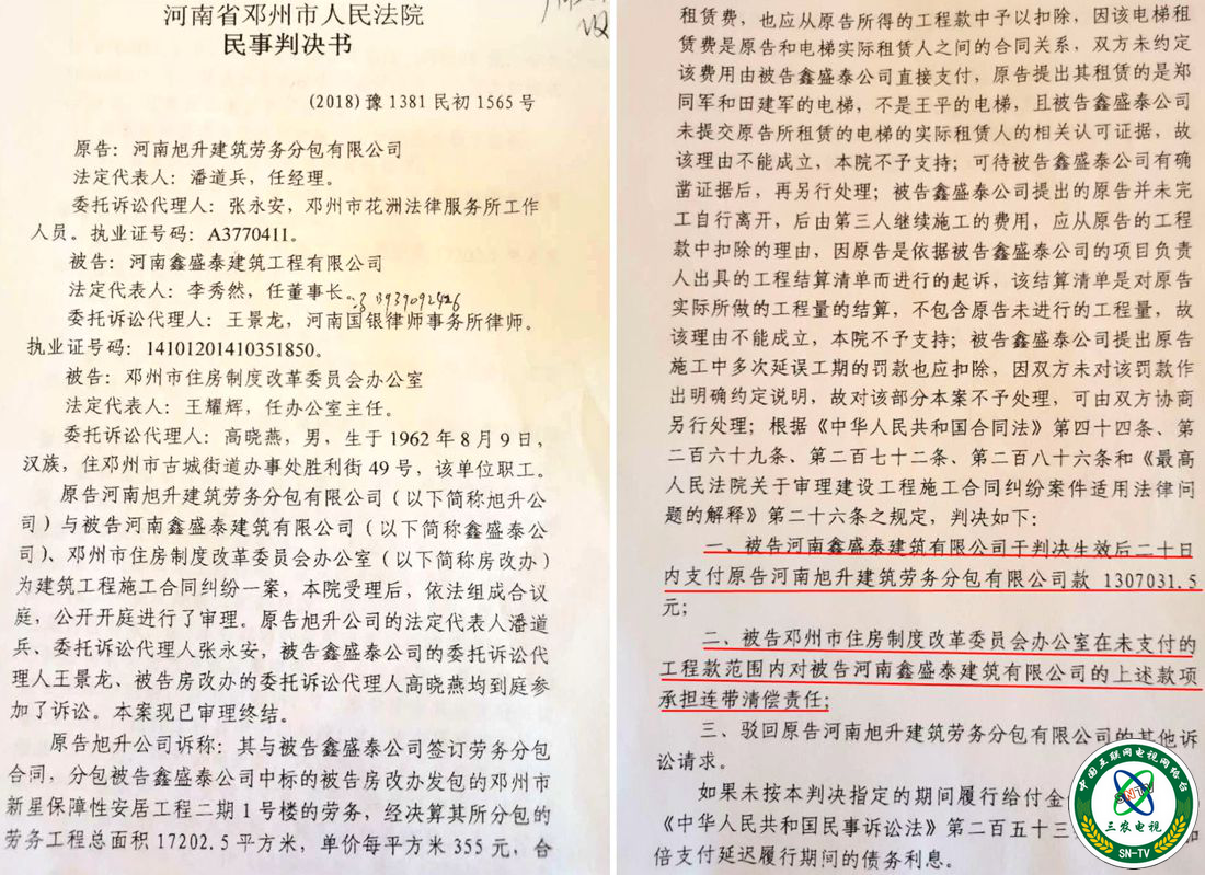 三农电视台消息:由河南省邓州市住房制度改革委员会办公室负责承建的“新星公共租赁住房二期”项目交工多年,至今施工单位还拖欠劳务公司及农民工资数百万元,被法院判决限期支付劳务款及工人工资并承担连带责任,而判决生效后至今多数农民工仍未拿到工资,遭遇执行难。对此,当地房改部门则拒绝回应此事。