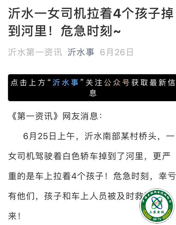 据公众号《沂水第一资讯》、《沂水事》披露,6月26日,山东省临沂市沂水县南部某乡镇的一条河内发生车辆落水事故,一女性司机及四名儿童与车辆一起落入水中,经一出租车司机与路人全力抢救,落水人员成功获救,车辆也成功吊出。参与抢救的人员有出租车司机和群众。据现场目击者证实,在参与抢救的人员当中,一个高个儿青年显得比较专业,抢救任务完成后,这个高个儿青年悄悄的开车离去,其驾驶车辆车门上贴有特殊标志,标志上有“0539”和“退役军人”字样。