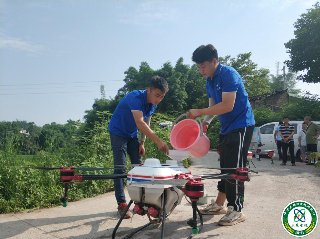 配药、装药、起飞、喷洒、降落……近日,在梅白镇文化村,长宁县植保社会化服务组织技术人员,正在利用无人机进行生物农药喷洒作业。