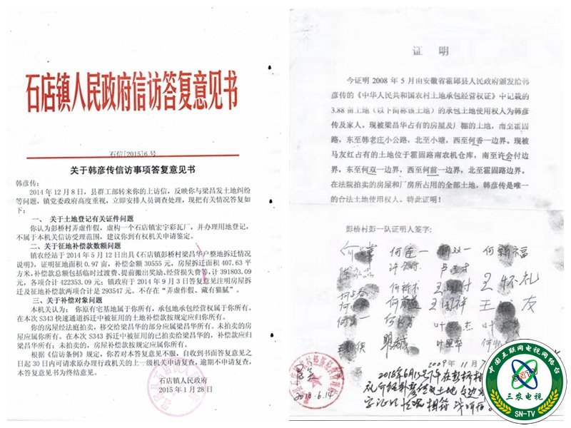 令人更加不可思议的是:在2013年霍邱县S343霍陈路改建工程中,韩彦传家庭上述位于路北、路南的土地被占用,但土地赔偿款却被梁昌华凭借虚假的建设用地使用证领取,韩彦传为此进行了信访维权。石店镇政府2015年给韩彦传出具的“石信【2015】6号《关于韩彦传信访事项答复书》中明确答复韩彦传,“本机关认为;你原有宅基地属于你所有,承包地承包经营权属于你所有,………”